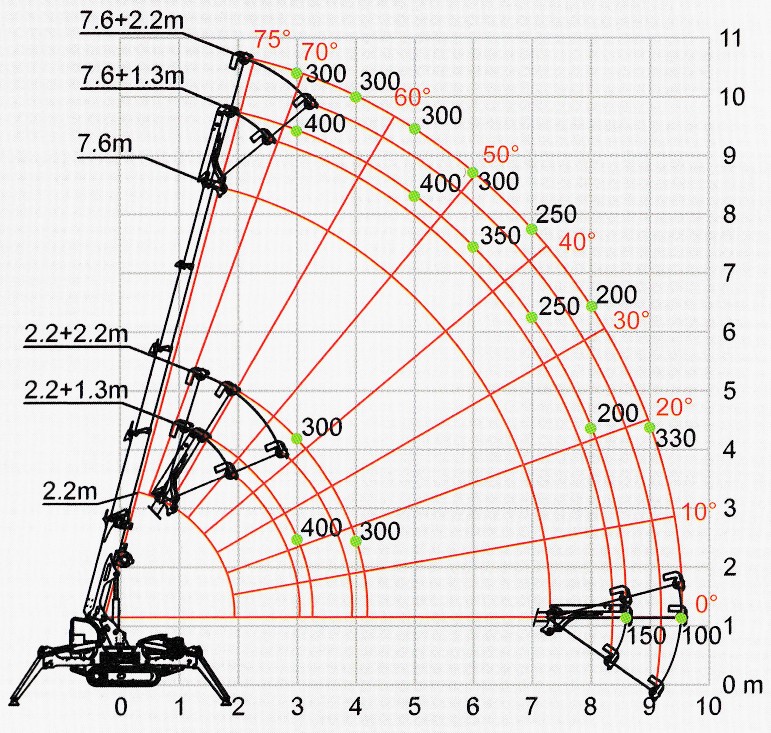 | Lastdiagramm SPX 312 C+ mit am Mast angebauter Montagespitze Jib 800.GX Traglast in dieser Kombination maximal 800 kg | |